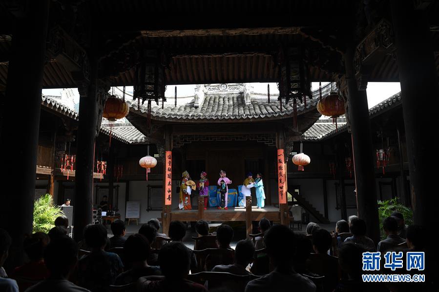 2017年9月13日,戏曲演员在浙江省仙居县溪港乡金竹岭脚村文化礼堂的仿古戏台上表演越剧《九斤姑娘》。