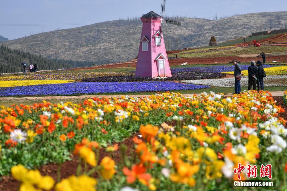 3月6日,游客在鲜花丛中拍照。当日,昆明市海口镇一高山花园内多种鲜花盛开,民众扶老携幼结伴春游,欣赏美景。中新社记者 任东 摄