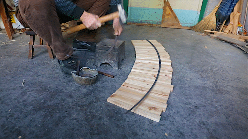 05 砸箍 工具原料:锤子、铁砧子、电转、铁钉、铁片 工艺流程:截断、砸弧(用铁锤砸铁片一侧,使铁片受力伸展,变成上大下小的弧形,以吻合木桶的弧度)→成圆→打眼→铆钉