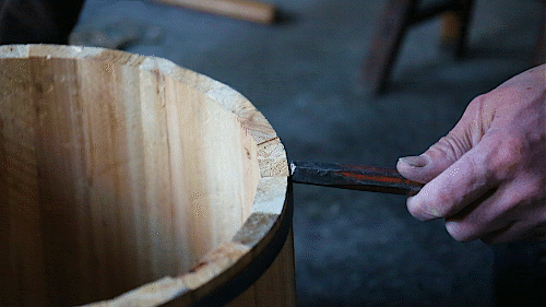 07 下箍 工具原料:铁锤、铁箍 工艺流程:下上箍→下底箍→齐板儿→规缝儿,用铁锤把铁箍往下敲,越敲铁箍就箍的越紧,在下箍过程中同时注意板儿与板儿之间的缝要规制整齐,最后再把桶底的木板敲齐。
