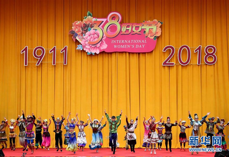 3月7日,演员们在招待会上表演集体舞《同心共筑中国梦》。 当日,纪念“三八”国际妇女节中外妇女招待会在北京隆重举行。 新华社记者 张玉薇 摄