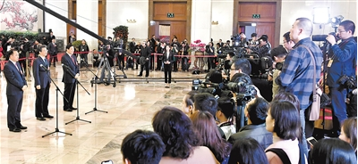 距离采访开始还有半小时,人民大会堂东门内中央大厅北侧的“代表通道”前便排起了一条“长龙”,许多记者架起“长枪短炮”翘首以待。14时09分,“代表通道”正式开启,在此起彼伏的闪光灯和快门声中,袁桐利代表和北京、天津代表团的两位代表一起率先亮相。