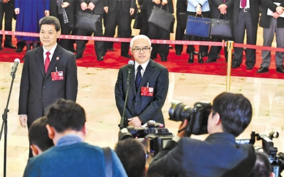 3月9日下午,十三届全国人大一次会议举行第二场“代表通道”集中采访活动,来自河北代表团的全国人大代表,省委常委、常务副省长袁桐利和全国人大代表,十二届全国人大法律委员会委员、清华大学法学院中国司法研究中心主任周光权,与其他8位全国人大代表一同接受中外媒体采访。