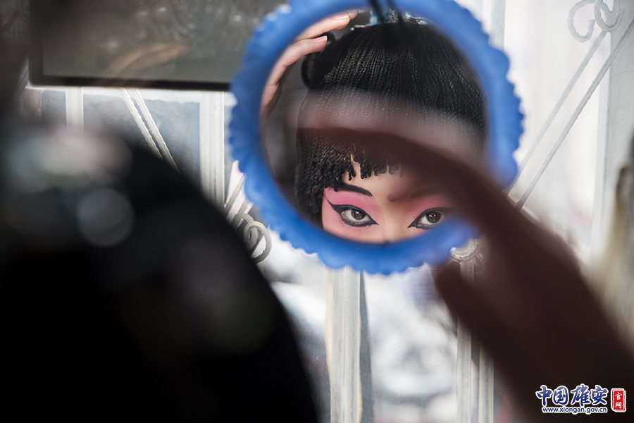 为了丰富村民文化生活,3月9日下午,保定市河北梆子华韵剧团为雄安新区容城县白塔村的村民奉献了一场精彩的河北梆子戏曲会。图为一名剧团演员正在整理妆容。王永康 摄