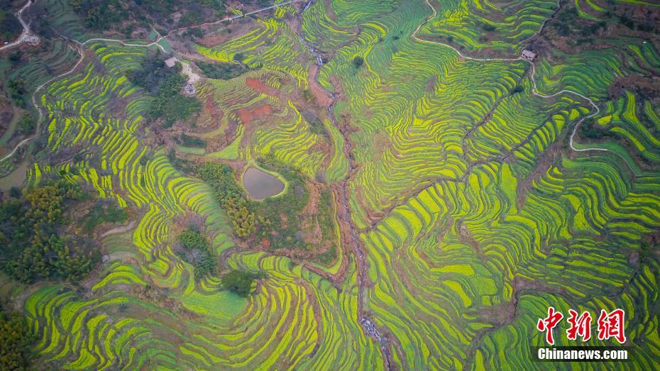 近日,江西婺源篁岭万亩油菜花进入盛花期。3月8日,航拍梯田花海美景。方华彬 摄