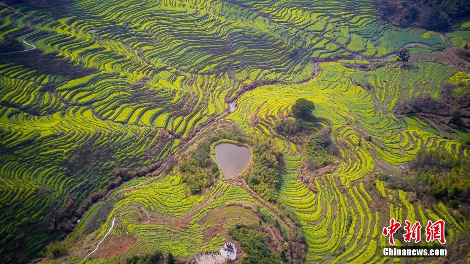 近日,江西婺源篁岭万亩油菜花进入盛花期。3月8日,航拍梯田花海美景。方华彬 摄