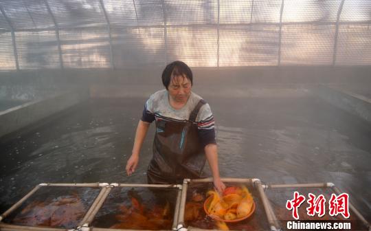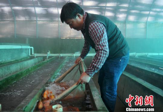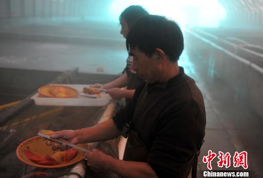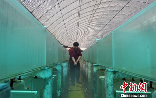 图为工人清理种鱼繁殖鱼缸。韩冰 摄