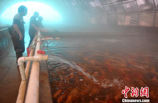 图为养殖池,可以看到大棚内水汽弥漫。韩冰 摄