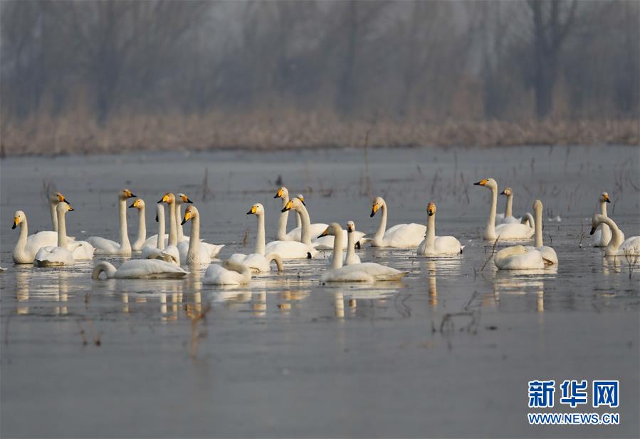 3月14日,一群天鹅在河北省怀来县官厅水库觅食。近年来,河北省怀来县大力实施官厅水库上游水生态湿地保护与修复工程项目,河岸防护林等生态工程,使水库及周边自然环境与水质得到了极大改善,成为天鹅等候鸟的理想中转站和栖息地。新华社记者 杨世尧 摄