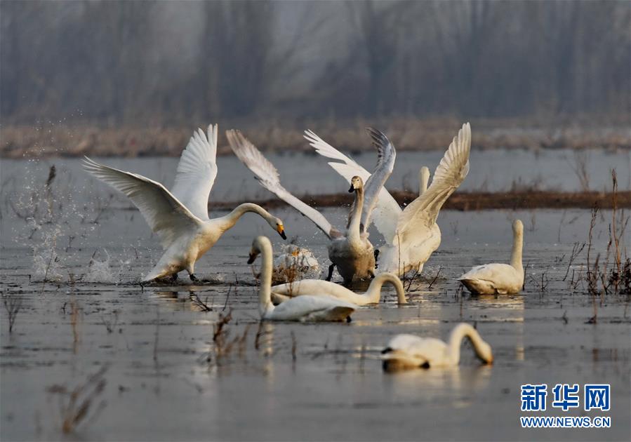 3月14日,一群天鹅在河北省怀来县官厅水库觅食。近年来,河北省怀来县大力实施官厅水库上游水生态湿地保护与修复工程项目,河岸防护林等生态工程,使水库及周边自然环境与水质得到了极大改善,成为天鹅等候鸟的理想中转站和栖息地。新华社记者 杨世尧 摄
