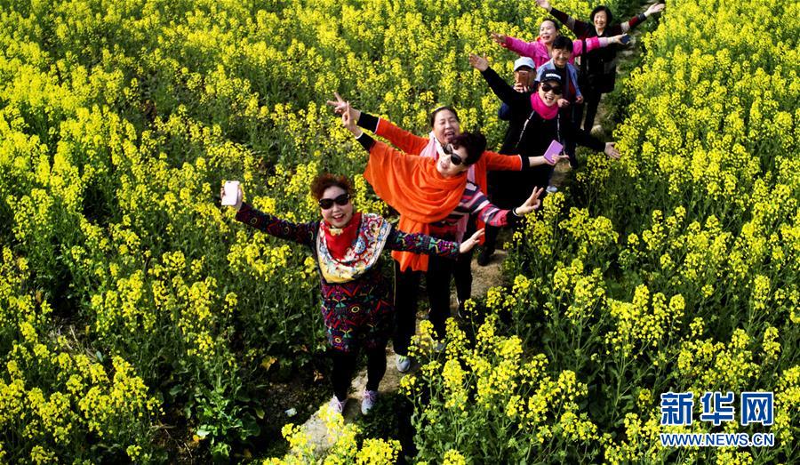 3月15日,游人在勉县定军山下的油菜花田里游玩(无人机拍摄)。近日,秦岭南麓的陕西省汉中市勉县定军山下15万亩油菜花竞相开放,吸引了众多游客前来踏春赏花。新华社记者陶明 摄
