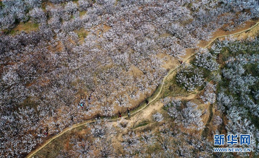 日前,陕西蓝田华胥镇上许村杏花谷里杏花绽放,连片的花海成为游人踏青休闲的好去处。