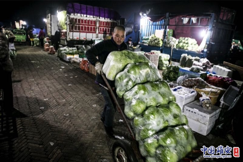 早市上的菜贩大多来自雄县各乡镇,为了四点钟准时营业,他们往往要提前一两个小时装车拉货。