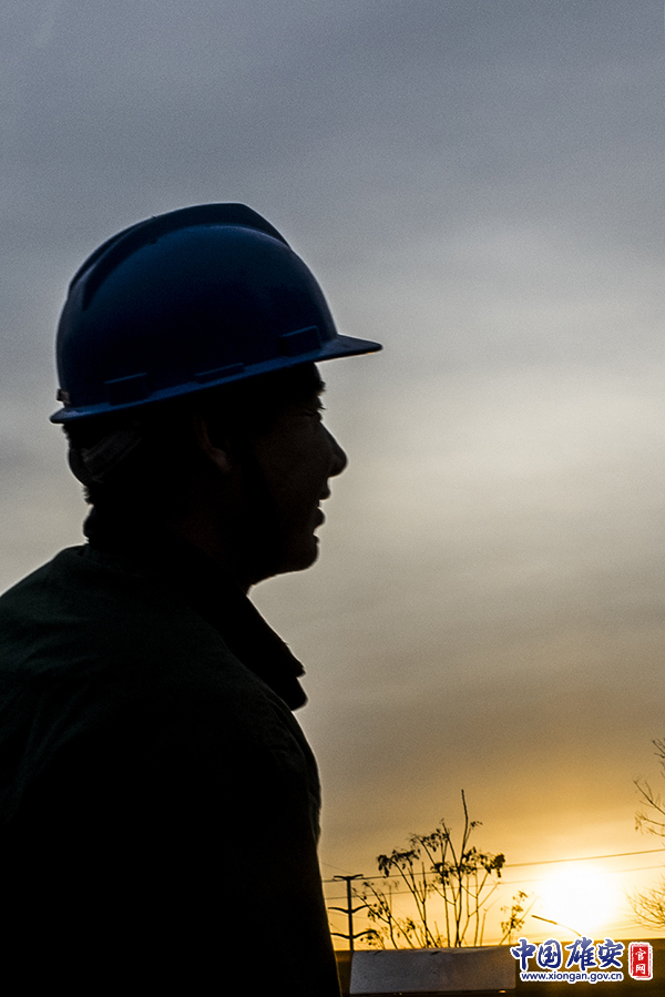 3月20日,在夕阳下,雄安新区容城县奥威路上辛勤工作的建设者。