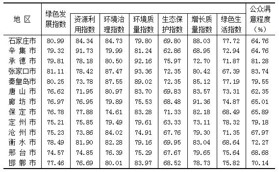 从2016年河北省生态文明建设年度评价结果看,各设区市绿色发展指数值从高到低的排序依次为:张家口、石家庄、秦皇岛、承德、衡水、邯郸、廊坊、保定、唐山、沧州、邢台。
