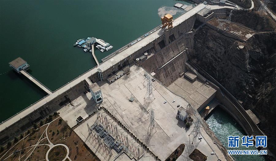 刘家峡水库库区和水库大坝(3月21日无人机拍摄)。 新华社记者陈斌摄
