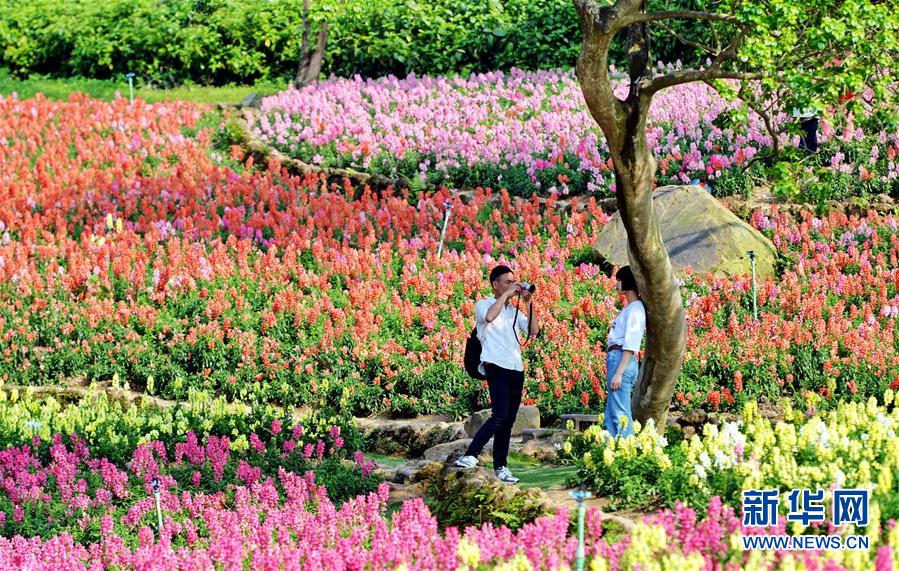 3月21日,游客在广西南宁青秀山风景区内赏花拍照。 新华社发(许东 摄)