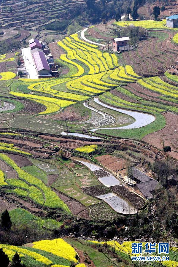这是3月22日在陕西省汉中市宁强县巴山镇拍摄的梯田油菜花。 新华社发(黎德华 摄)