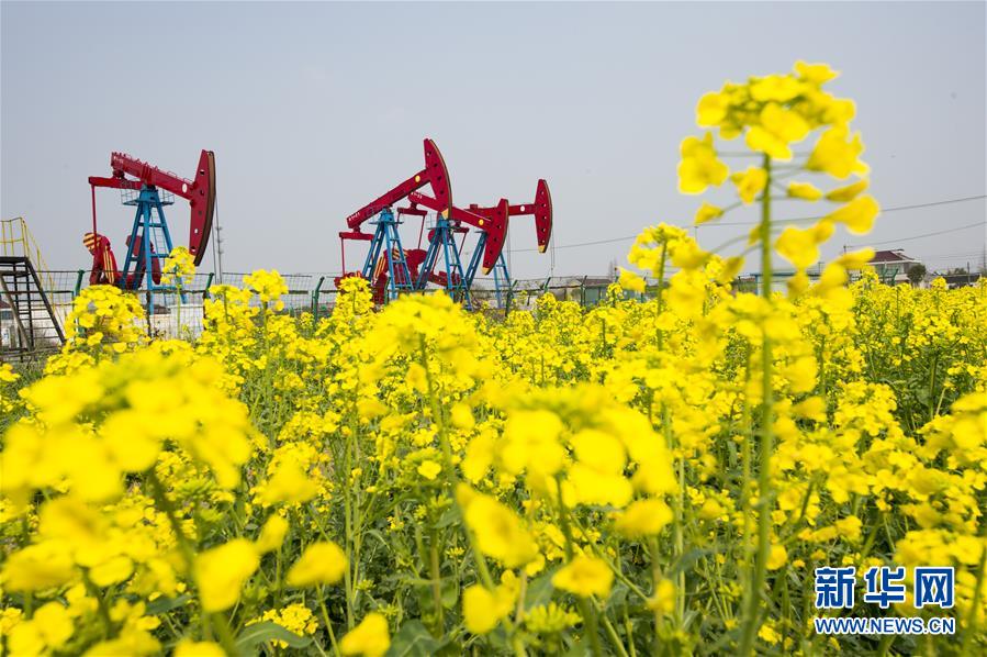 3月22日,采油机在江苏海安盛开的油菜花丛中工作。 新华社发(徐劲柏 摄)