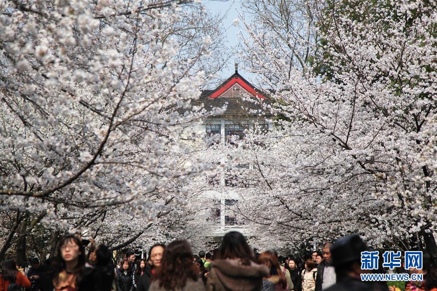 3月22日,人们走在南京林业大学的“樱花大道”上。 新华社发(刘建华 摄)