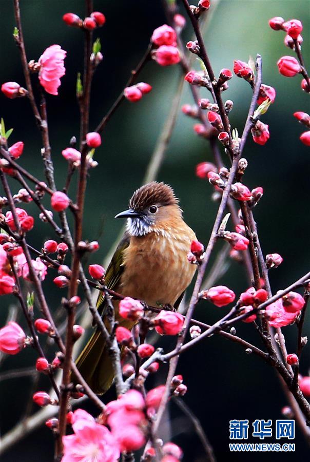 3月21日,在安徽黄山脚下,一只小鸟飞落在枝头上。 新华社发(施广德 摄)