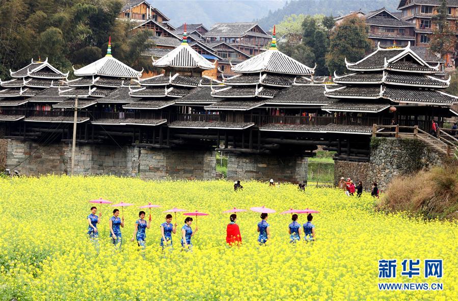 3月21日,在广西三江侗族自治县林溪镇,旗袍爱好者行走在油菜花田中。 新华社发(吴练勋 摄)