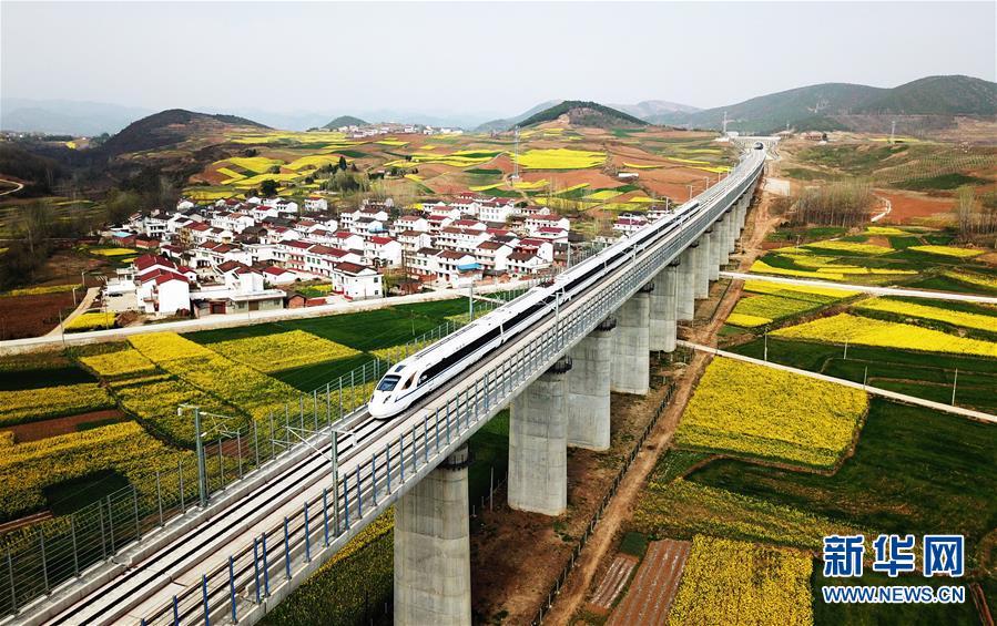 3月21日,一列动车组列车行驶在西成高铁陕西汉中洋县段。 新华社发(唐振江 摄)