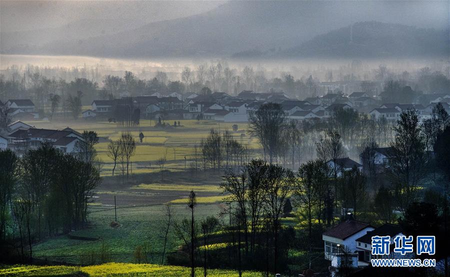 3月22日拍摄的晨雾中的汉中市南郑县新集镇油菜花海与农舍。 新华社记者 陶明 摄