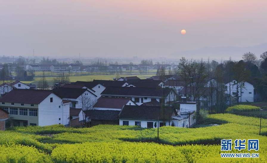 3月22日,一轮红日映衬着的汉中市南郑县新集镇岳家岭村的油菜花海。 新华社发(王平 摄)