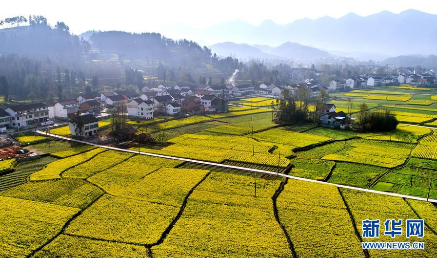 3月22日拍摄的汉中市勉县元墩镇元墩村盛开的油菜花(无人机拍摄)。 新华社记者 陶明 摄