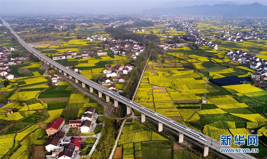 3月21日,一列动车正通过汉中市南郑县新集镇油菜花海(无人机拍摄)。 新华社记者 陶明 摄