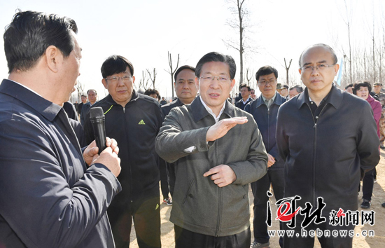 3月24日上午,王东峰、许勤、叶冬松等省领导来到石家庄市环城林建设现场,参加义务植树活动。植树前,省领导认真听取了石家庄市造林绿化工作汇报。 记者陈建宇 赵威摄