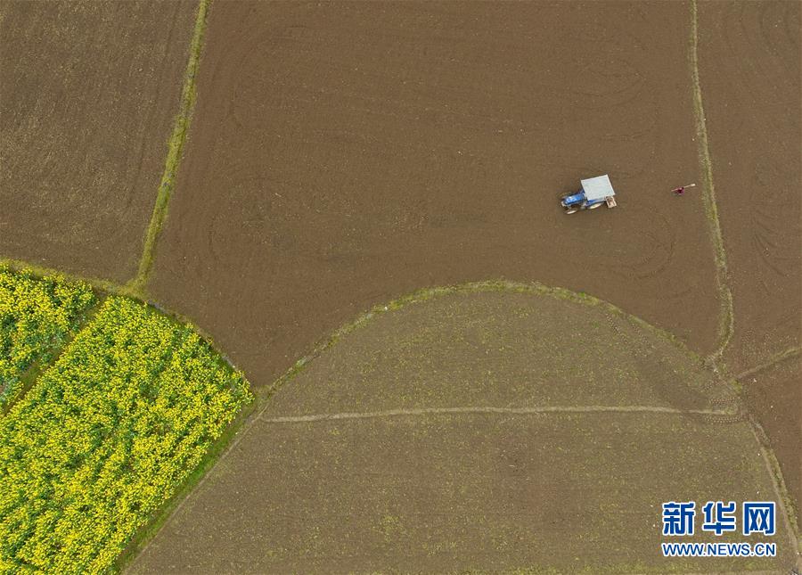 3月25日,湖南省湘西土家族苗族自治州龙山县召市镇的农民在耕地(无人机拍摄)。 春回大地,各地农民抓住农时,在田间辛勤劳作。新华社发(曾祥辉 摄)