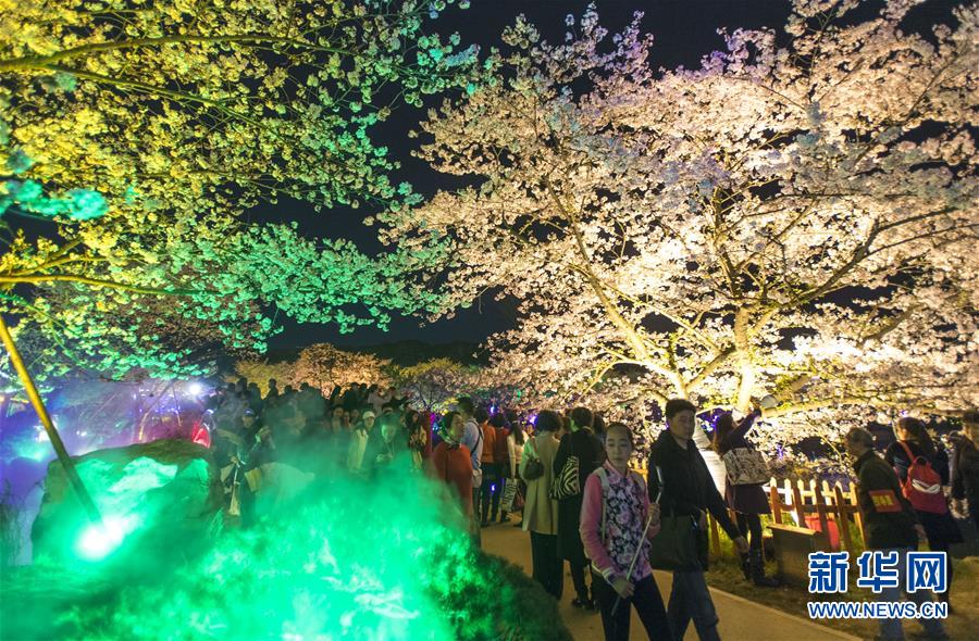 近日,武汉东湖樱花园的樱花竞相绽放。园区还在夜间开启装饰灯光,供游客在夜色中观赏,吸引大量游客前来踏春赏花。