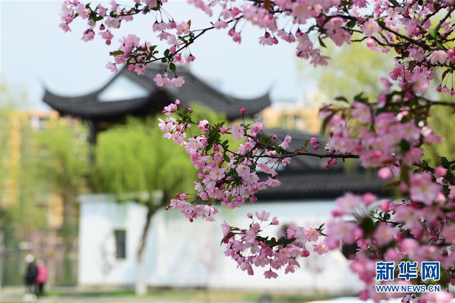 3月26日,在江苏南京莫愁湖公园,盛开的海棠和远处的建筑与绿柳形成一幅美丽的画卷。 新华社发(王跃武 摄)