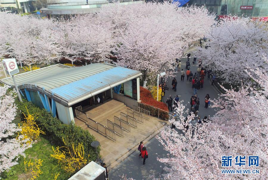 3月26日,在上海地铁8号线虹口足球场站出口处,市民在观赏拍摄盛开的樱花。新华社发(沈春琛 摄)
