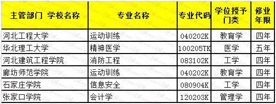 本次公布的高校本科专业备案和审批结果中,共涉及河北39所高校,其中,新增备案本科专业的涉及37所高校113个专业,新增审批本科专业的涉及6所高校6个专业,调整学位授予门类或修业年限专业的涉及1所高校1个专业。此外,还有两所大学的6个本科专业此次予以撤销。具体名单如下: