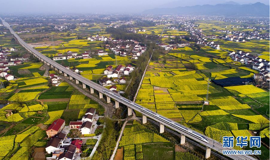 3月21日,一列动车正通过陕西省汉中市南郑县新集镇油菜花海(无人机拍摄)。初春时节,万象更新,生机盎然。刚刚结束的全国两会为党的十九大擘画的宏伟蓝图制定了开局之年的施工方案。思想指引实践,理念引领行动。从东部沿海到西部边陲,从华北平原到南国大地,神州大地处处涌动着改革创新的澎湃热潮,迸发出干事创业的磅礴力量。在习近平新时代中国特色社会主义思想指引下,中国经济社会发展呈现出蓬勃生机,亿万人民在以习近平同志为核心的党中央坚强领导下,冲刺全面建成小康社会,阔步踏上全面建设社会主义现代化国家新征程。新华社记者 陶明 摄