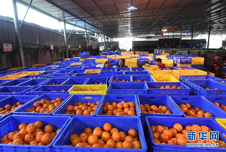 3月17日,工作人员在位于重庆市奉节县草堂镇欧云村的脐橙分选包装车间内堆放脐橙。新华社记者 王全超 摄