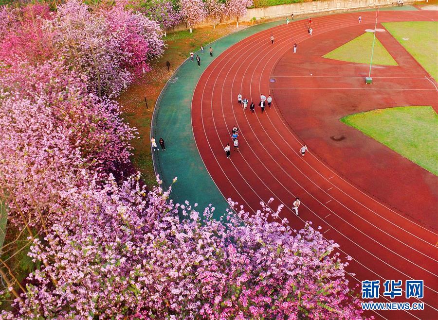 3月26日,在广西柳州市鹿山学院,大学生在校园里跑步。寒冬挥手去,春天翩然来。草木蔓发,鸟语花香,春风浅吟低语,呼唤人们投入自然的怀抱,赴一场春天的约会。 新华社发(黎寒池 摄)