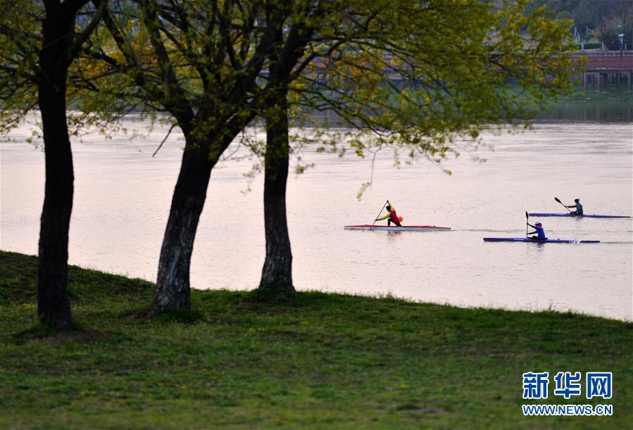 3月21日,安徽省六安市的皮划艇运动员在淠河月亮岛水域训练。寒冬挥手去,春天翩然来。草木蔓发,鸟语花香,春风浅吟低语,呼唤人们投入自然的怀抱,赴一场春天的约会。 新华社发(郑金强 摄)