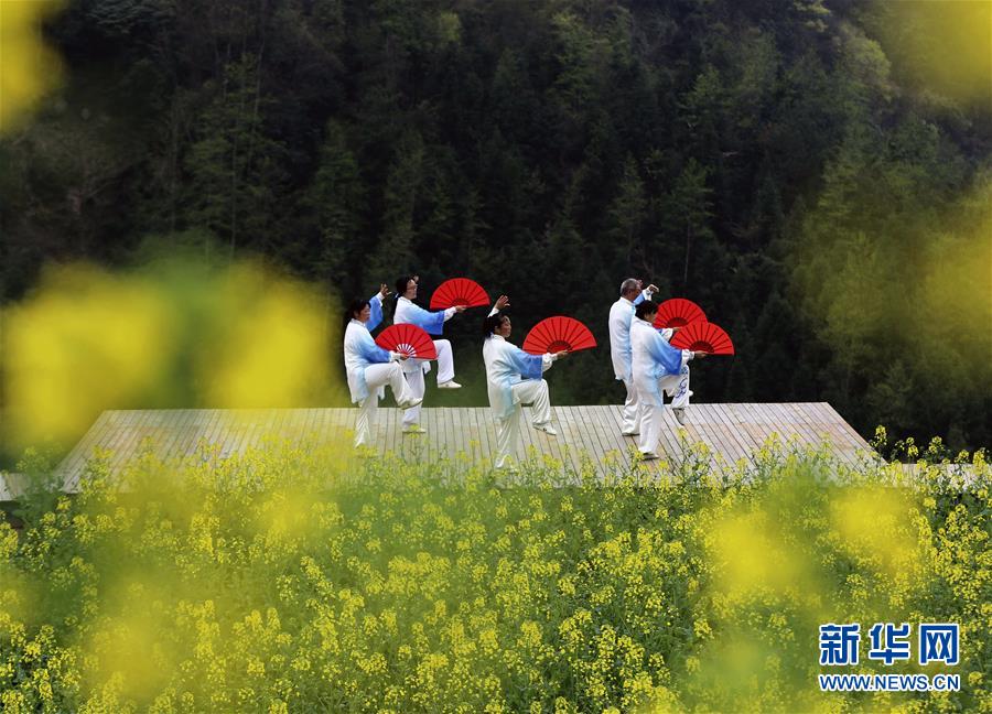 3月16日,太极扇爱好者在湖南张家界五号山谷乡村民宿的油菜花旁锻炼。寒冬挥手去,春天翩然来。草木蔓发,鸟语花香,春风浅吟低语,呼唤人们投入自然的怀抱,赴一场春天的约会。 新华社发(吴勇兵 摄)