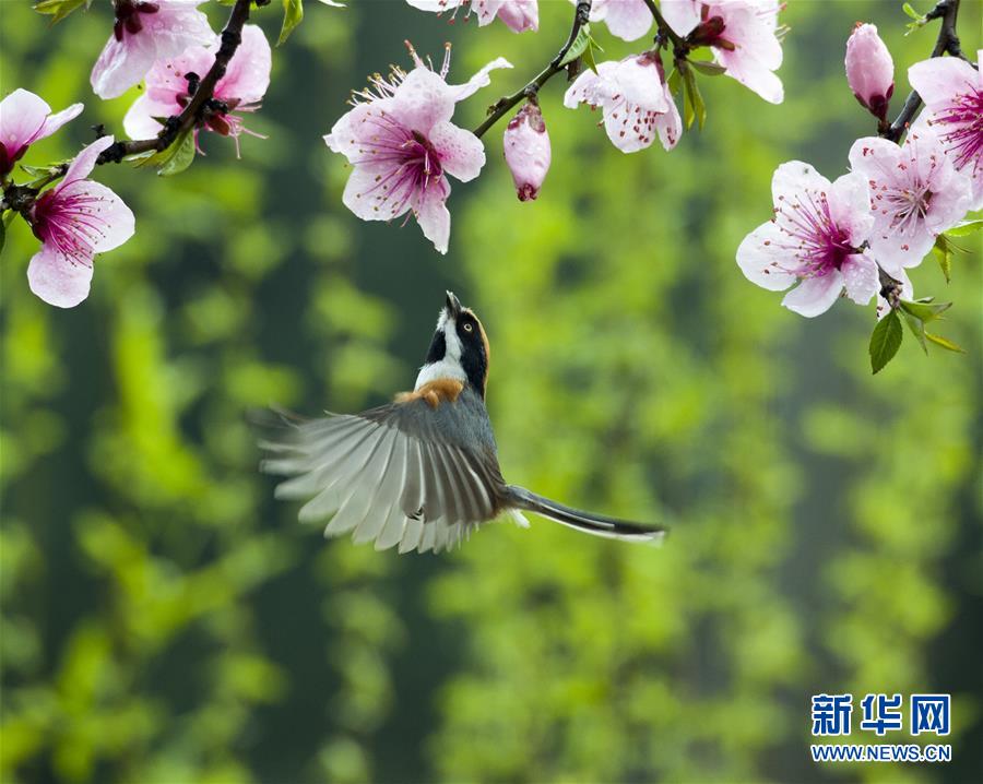3月21日,一只小鸟在江苏无锡市蠡湖湿地公园盛开的桃花间飞舞。寒冬挥手去,春天翩然来。草木蔓发,鸟语花香,春风浅吟低语,呼唤人们投入自然的怀抱,赴一场春天的约会。 新华社发(潘正光 摄)