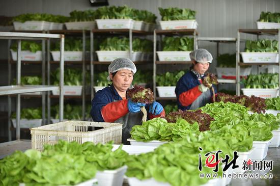 3月19日,永清县新苑阳光现代农业产业园蔬菜加工车间,工人正进行活体盆栽蔬菜包装。 记者霍艳恩摄