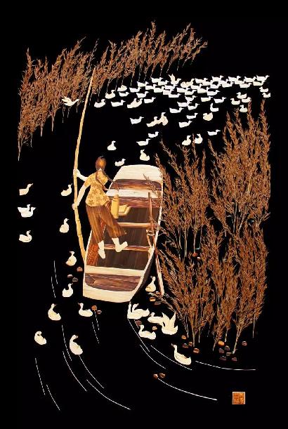 芦苇画材料选用白洋淀6月萌芽后的芦苇, 经过分类、切割、压平、雕刻、编织、组装等等多道工序精心制作而成,是纯天然的绿色艺术。