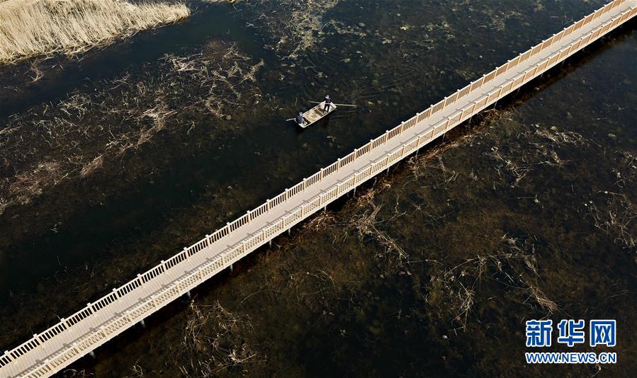工人在白洋淀景区内清理漂浮物(3月29日无人机拍摄)。自2017年4月1日横空出世,白洋淀所在的河北雄安新区设立至今已届周年。雄安新区设立一周年之际,世界目光再次聚焦这个新时代中国改革开放的新地标。新华社记者 杨世尧 摄