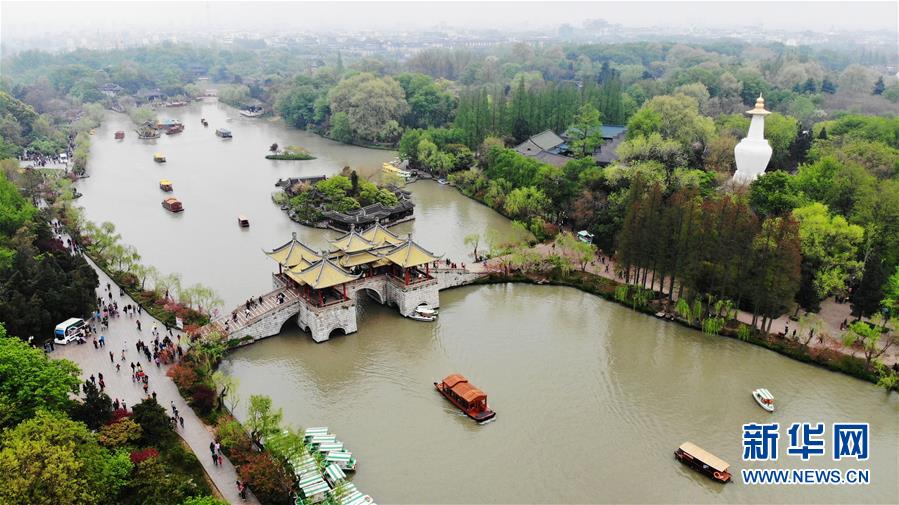 4月5日,游人乘坐游船在扬州瘦西湖风景区游玩。清明小长假期间,人们纷纷走到户外,踏青赏花,亲近自然。 新华社发(孟德龙 摄)