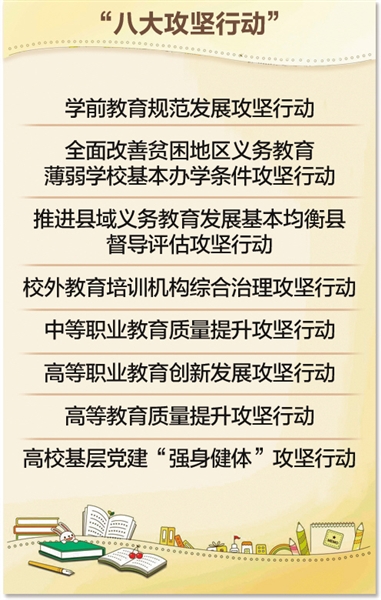 “八大攻坚行动”分别为:学前教育规范发展攻坚行动、全面改善贫困地区义务教育薄弱学校基本办学条件攻坚行动、推进县域义务教育发展基本均衡县督导评估攻坚行动、校外教育培训机构综合治理攻坚行动、中等职业教育质量提升攻坚行动、高等职业教育创新发展攻坚行动、高等教育质量提升攻坚行动、高校基层党建“强身健体”攻坚行动。