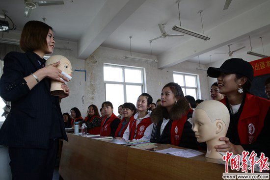 4月4日,雄安新区容城县晾马台乡南阳中学培训点,刘慧敏老师(左)正在给美容培训班上的学员讲授面部清洁的要领。据介绍,去年以来,雄安新区积极实施对当地居民的免费系列职业培训,帮助居民尽快在新区就业。记者 陈剑/摄