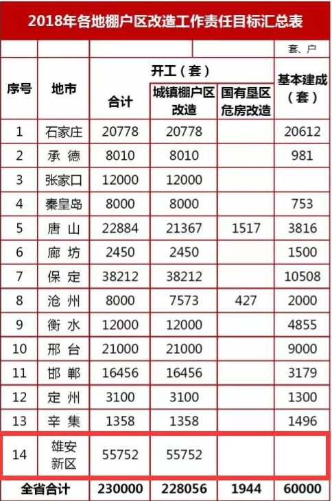 2018年完成棚改开工23万套任务,各市(含定州、辛集市)和雄安新区棚户区改造任务↓